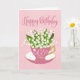 A quaint little pink teacup filled with a beautiful bunch of lily of the valley flowers along with the hand lettered words Happy Birthday on the top of card and the hand lettered words 68 today with love hearts on the tea cup. A sweet birthday card for someone special turning 68 today!