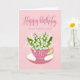 A quaint little pink tea cup filled with a beautiful bunch of lily of the valley flowers along with the hand lettered words Happy Birthday on the top of card and the hand lettered words 76 today with love hearts on the tea cup. A sweet birthday card for your aunt turning 76 today!