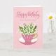 A quaint little pink tea cup filled with a beautiful bunch of lily of the valley flowers along with the hand lettered words Happy Birthday on the top of card and the hand lettered words 77 today with love hearts on the tea cup. A sweet birthday card for your aunt turning 77 today!