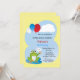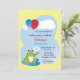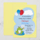 A children's birthday party invite with an original illustration of a green frog on a lily pad holding red and blue balloons.
