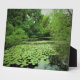 A beautiful natural area at the Molalla River State Park in Canby, Oregon. Lush green trees & bushes in the Spring, with lily pads sprinkled on the dark reflective pond.