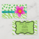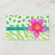 Ceate a stylish business card for a great impression. Colourful stripe zebra skin and cheetah or leopard skin graphic design is one of the hottest art and design trends, and is extremely popular from fashion to home decor. This sophisticated lime green, white and turquoise teal green zebra and cheetah print collection is designed for style. A fuchsia and pink flower is on the front on a turquoise teal bar strip that is customisable with your or your business name. The back has a lime green area for all of your contact information for your business or for personal use. This card is available in multiple colour combinations.