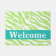 Welcome visitors to your home with this stylish and sophisticated lime green and white zebra skin pattern door mat. This door mat is customised with the word Welcome that you can change to another word or name. A turquoise teal blue strip gives an area for personalisation and an additional pop of colour. Enjoy this popular and contemporary design that will add a trendy home decorative accent. This design is available in several colour combinations in this store.