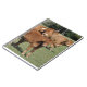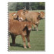 A notebook with a photo of a golden brown limousin cow with horns, licking it's calf, while the calf is licking his own nose.