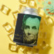 This poster depicts a text-driven, graphic of President Abraham Lincoln--seated and facing front. The text from the Gettysburg Address is wrapped around the contours of his face. The colour scheme is sepia, teal, black, grey and white.