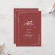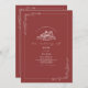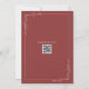 Illustration of barn at top with line art botanical border. Background is muted red colour. Back side features QR code for RSVP