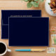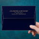 A winter wedding lined envelope, inspired by a snowy night, features a dark blue watercolor background with the wording in gold.