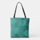 This tote bag has a mid-century modern design of black vertical lines with white circles on top on a field of turquoise.