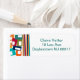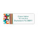 These return address labels have a mid-century modern design of lines and rectangles in retro shades of orange, gold, cranberry, teal, green, blue, turquoise, and green.