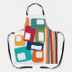 This apron has a mid-century modern design of lines and rectangles in retro shades of orange, gold, cranberry, teal, green, blue, turquoise, and green.