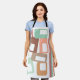 This apron has a mid-century modern design of lines and rectangles in retro shades of red, yellow, orange, blue, green, brown, and pink.