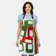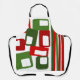 This apron has a mid-century modern Christmas design of lines and rectangles in retro shades of red and green.