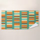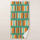 This towel set has a light seafoam washcloth, a darker orange hand towel, and a bath towel with a mid-century modern design of horizontal lines made from vertical stripes in seafoam, off-white, two oranges, and brown.