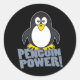 A stylised penguin sticker with the words "Penguin Power!", symbolic of the Linux operating system.