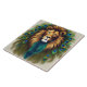 A face on lion's head surrounded in peacock feathers as an extension of it's mane.