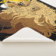 Profile portrait of a lion with tribal art . A yellow mandal sun hits in behind the lion in a backdrop of black.