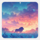 A powerful lion silhouette stands quietly in a moonlit meadow, surrounded by a glowing twilight sky painted in rich purples, pinks, and deep blues. Wisps of clouds and sparkling stars scatter across the heavens, blending into the soft glow of sunset. Beneath the lion’s poised stance, a bed of flowers and wild grass adds a layer of magic and calm to the scene.