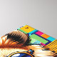 The image is a digital illustration of a lion dressed in a stylish manner, standing in the centre against a vibrant and colourful geometric background. The animal has round sunglasses with blue lenses and a jacket that boasts colourful geometric patterns. The animal's pose and accessories suggest a cool and confident demeanour. The backdrop is a kaleidoscope of colours, including yellow, red, blue, orange, brown, and green, composed of various irregular geometric shapes that contribute to creating a lively and dynamic atmosphere.
