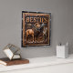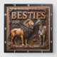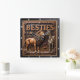 This dramatic square wall clock features a highly dimensional, close-up illustration of a brown lion with an expressive face and a striped zebra standing closely together. The entire design is rendered in muted brown, tan, and dark leather-like tones, strongly suggesting a deep sculpted relief or Sculpted Leather Look. The lion has a detailed mane and is positioned on the left, while the zebra is on the right, appearing happy with prominent stripes. They are surrounded by an elaborate wreath of gnarled, dark tree roots and stylized leaves carved into the perimeter. The background is a dark, heavily textured leather panel. The large, three-dimensional embossed text "BESTIES FOR LIFE" is carved across the top center in a bold, golden serif font. The clock face features a simple clock face border with large, white, numbered tick marks (1 to 12) integrated into the outer frame. The artwork is surrounded by a thick, dark brown decorative border that resembles a black wood frame.