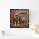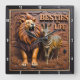 This dramatic square wall clock features a highly dimensional illustration of a brown lion and a striped zebra standing closely together. The entire design is rendered in muted brown, tan, and dark leather-like tones, strongly suggesting a deep sculpted relief or Sculpted Leather Look. The lion has a textured mane and is positioned on the left, looking forward, while the zebra is on the right, appearing happy and relaxed with prominent stripes. They are framed by a simple border of stylized leaves and vines carved into the perimeter. The background is a dark, heavily textured leather panel with carved foliage elements. The large, three-dimensional embossed text "BESTIES FOR LIFE" is carved across the top center in a bold, golden serif font. The clock face features a simple clock face border with large, white, numbered tick marks (1 to 12) integrated into the outer frame. The artwork is surrounded by a thick, dark brown decorative border that resembles a black wood frame.