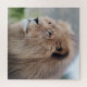 In the image, a male lion stands proudly against a light background. His majestic mane frames his noble face, exuding strength and authority. At his feet lies a vibrant green leaf, symbolising the harmony between the king of beasts and the natural world