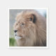 In the image, a male lion stands proudly against a light background. His majestic mane frames his noble face, exuding strength and authority. At his feet lies a vibrant green leaf, symbolising the harmony between the king of beasts and the natural world