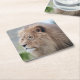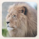 In the image, a male lion stands proudly against a light background. His majestic mane frames his noble face, exuding strength and authority. At his feet lies a vibrant green leaf, symbolising the harmony between the king of beasts and the natural world