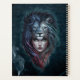 Lion's heart and feminine strength, a majestic fusion. This is a striking portrait of a woman whose appearance is complemented by a seamless fusion with the head of a majestic lion. The woman has fair skin and bright green eyes, framed by a delicate white pattern, emphasising her expressiveness. Her hair is styled to blend seamlessly into the lion's mane—a flowing union that creates the impression that they are one. The lion's mane is painted in blue-grey tones, lending the image a powerful presence, while the lion's piercing eyes convey an intense gaze.