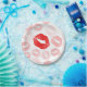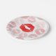 This fun paper plate feaures multiple red lipstick prints on a white background.