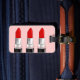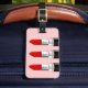This luggage tag features three red lipsticks on the front, and customisable text on the back. The pink backgrounds can be customised as desired.
