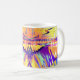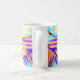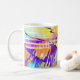 Coffee mug with my design of straight lines and wavy colours mixed together to make an eye-catching and modern looking "just painted" look with prominent colours of orange, yellow, purple, and splashes of pink and blue.