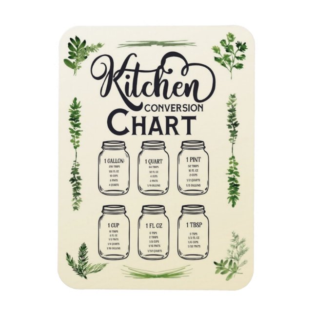 Liquid measurement kitchen conversion chart magnet keeps cooking information handy while adding some charm to your fridge with this quaint mason jar and watercolor herb design.