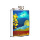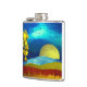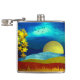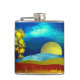A beautiful abstract landscape design with a unique sky resembling ripples in liquid and a moon, mountains, and a golden tree.