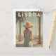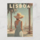 This charming vintage poster depicts a graceful woman in a classic 1950s dress standing at the harbour in Lisbon. Fishing boats gently float on the water behind her, while the sun casts a warm, golden glow over the historic buildings in the background. The soft retro colour palette and nostalgic textures capture the elegance of mid-century coastal life in Portugal. Perfect for lovers of vintage fashion, seaside scenes, and timeless European travel art.