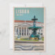 Lisbon, Portugal. Retro Vintage Travel Poster of Lisboa featuring Dona Maria II National Theatre in Dom Pedro IV Square best known as Rossio Square. Also seen its one of the oxidised green bronze fountains with mermaids shooting water. At the bottom it’s shown the typical Portuguese black and white cobblestone pavements decorated with wavy lines.