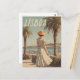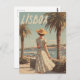 This charming vintage poster depicts a graceful woman in a classic 1950s dress standing at the harbour in Lisbon. Fishing boats gently float on the water behind her, while the sun casts a warm, golden glow over the historic buildings in the background. The soft retro colour palette and nostalgic textures capture the elegance of mid-century coastal life in Portugal. Perfect for lovers of vintage fashion, seaside scenes, and timeless European travel art.