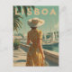 This charming vintage poster depicts a graceful woman in a classic 1950s dress standing at the harbour in Lisbon. Fishing boats gently float on the water behind her, while the sun casts a warm, golden glow over the historic buildings in the background. The soft retro colour palette and nostalgic textures capture the elegance of mid-century coastal life in Portugal. Perfect for lovers of vintage fashion, seaside scenes, and timeless European travel art.