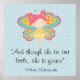 Shakespeare's "and tho' she be but little, she is fierce" quote with cute butterfly fairy on blue heart patterned background.