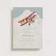 Get ready to take flight with this vintage style baby shower invitation! Against a light blue background, an adorable little red aeroplane soars above the clouds. With its charming hand-drawn style, this little aeroplane is sure to capture the hearts of your guests and set the tone for a fun and adventurous baby shower.