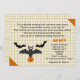 For a fun way to invite your Halloween baby shower guests send them this little bat baby shower invitation card in the mail. The invitation card offers a light cream chequerboard background with pumpkin orange tips to the top right and bottom left of the card. The background has been combined with three little bats, two bats happily swooping across the card front and one little bat perched on a pumpkin to the left of the card. You will also find full party information details on the front of the card that can be personalised with your own Halloween baby shower party details. Flip the invitation over to find the same chequerboard background placed on the back of the card too. Great for an It's A Boy, Girl or Neutral themed Halloween baby shower party celebration.