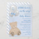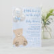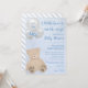 A little bear cub on the way baby shower invitation for a boy features watercolor teddy bear cub and balloons. Back of invite has diagonal watercolor stripes and baby booties.