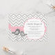 Adorable grey chevron with a cute little birdies and a pink ribbon and frame. Great for a girl, twins baby shower or a birthday celebration for a little one!