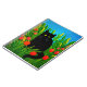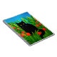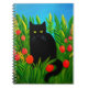Notebook in a little black cat with yellow eyes, sitting in a garden, surrounded by red tulips and green foliage