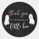 Halloween theme gender reveal party featuring illustration of a girl and boy ghosts. The text says "thank you for showering our little boo."