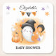 Halloween Baby Shower paper coaster A Little Boo is almost due. Cute watercolor baby ghost and pumpkins, hearts and stars in orange, black and purple. Easily personalise the text. You can use it for a baby shower or any other kids Halloween party. - Kate Eden Art