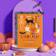 This cute "a little boo is almost due" halloween gender-neutral baby shower invitation features an orange background with Halloween motif including a black cat, bat, ghosts, skeleton, broomstick, pumpkin, candy, vampire lips, eyeball, and bone. The reverse side features a dark grey background with spider web patterns. Personalise it for your needs. You can find matching products at my store.