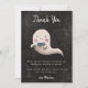 Cute halloween theme birthday party thank you template card featuring an illustration of a ghost with a blue bow tie on a black chalkboard background. The message thanks the guest for attending the party and for the gift. Perfect fall theme for a boy's birthday.