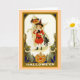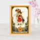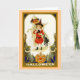 Vintage Halloween card showing a little boy dressed in a wizard's hat and holding a magic wand. Behind him is a ghost with a pumpkin head and a black cat. In front are two cats with brooms and witch's hats and a scowling pumpkin face.