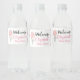 A water bottle label for a baby shower or other event. Designed with a whimsical white bunny holding a big pink balloon floating up in the air. Pink polka dot circles create a cute and charming pattern layered over a light blue=green background.