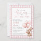 This charming baby shower invitation features a cute little bunny holding balloons and a pink gingham background. With your registry QR code and event details on the reverse. Designed by Thisisnotme©